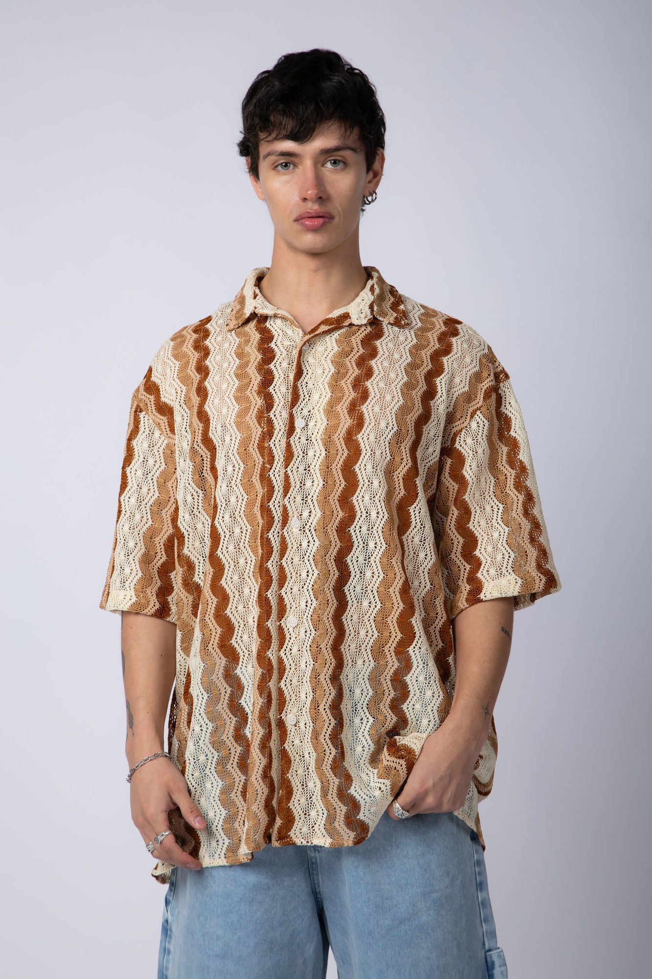 Camisa Jano de manga corta con un diseño en crochet que resalta sus ondas en tonos tierra y beige, ofreciendo un estilo único y fresco para los días de verano. Ideal para destacar con elegancia y personalidad.